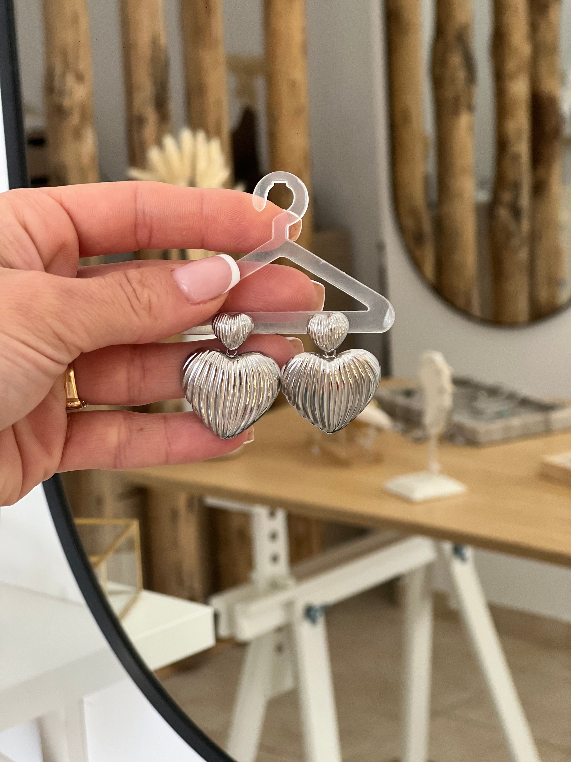 Αναβαθμίστε το στυλ σας με τα σκουλαρίκια Bella ασημί απόχρωσης σε σχήμα διπλής καρδιάς από ανοξείδωτο ατσάλι. Τα σκουλαρίκια προσφέρουν μια μοντέρνα εμφάνιση ενώ ταυτόχρονα είναι ανθεκτικά. Ολοκληρώστε την εμφάνισή σας με αυτά τα εντυπωσιακά αξεσουάρ.