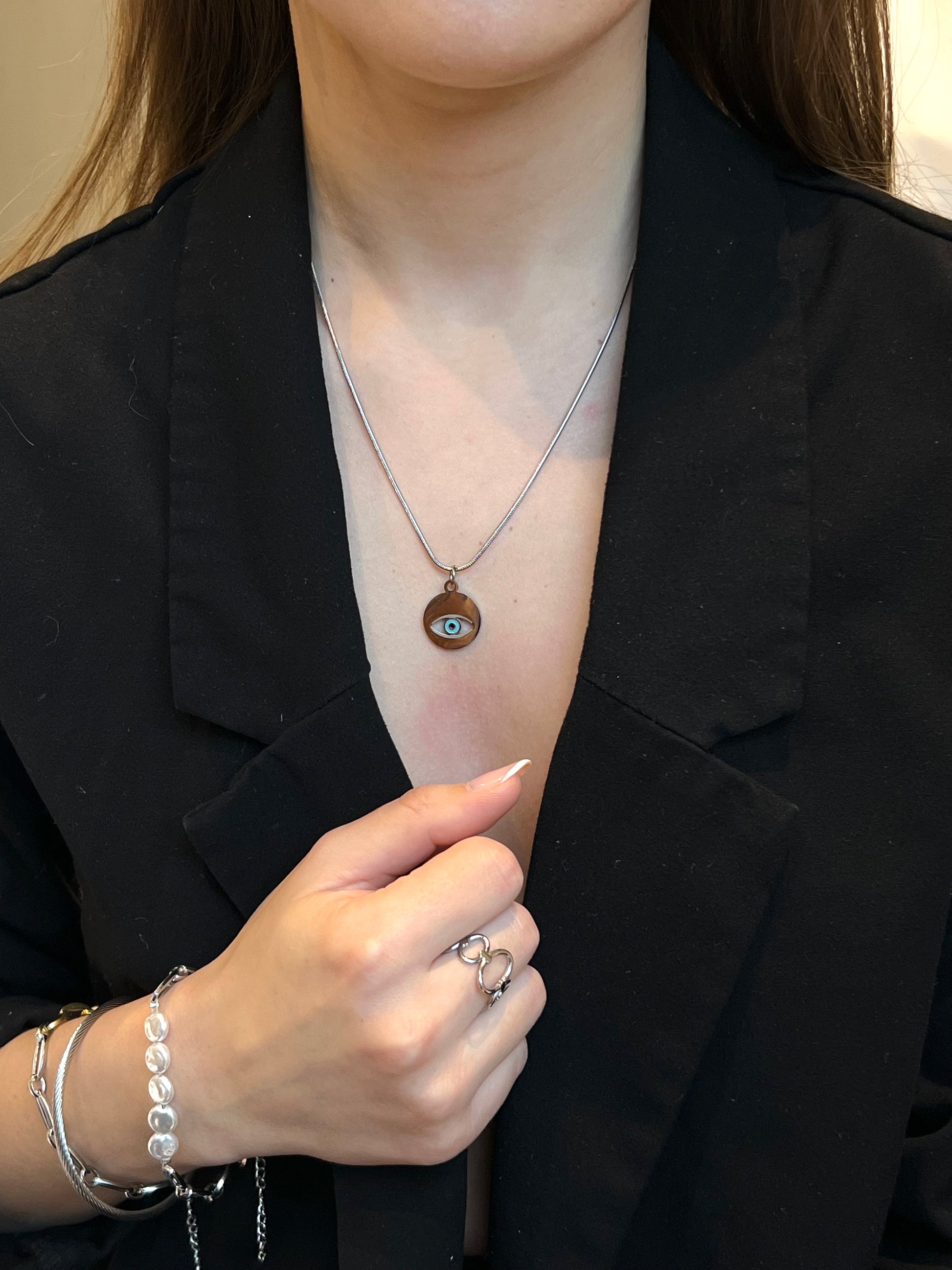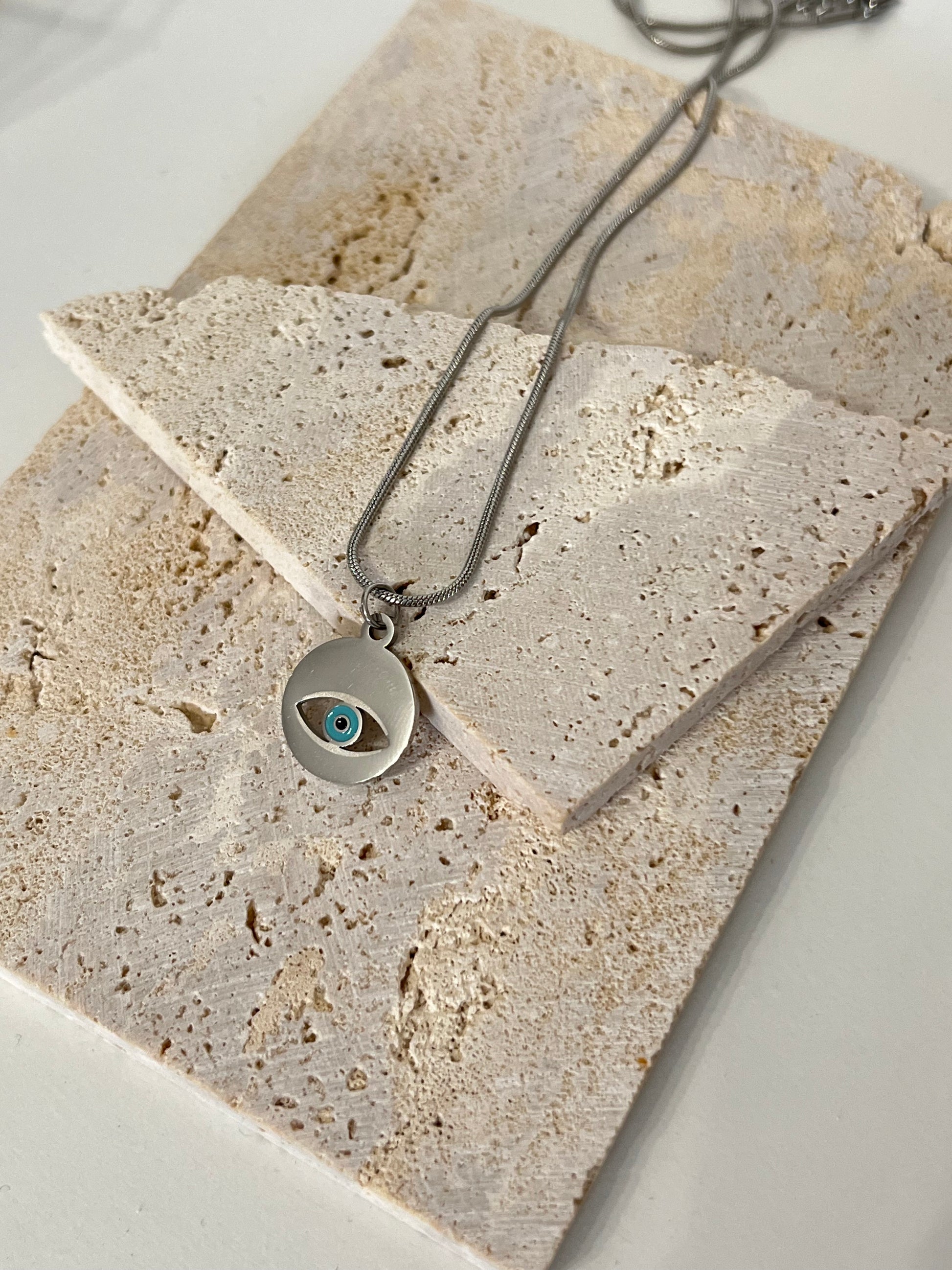 Αφεθείτε στη μαγευτική ομορφιά του Blue Eye. Αυτό το εκπληκτικό κολιέι διαθέτει μια ασημένια αλυσίδα από ανοξείδωτο ατσάλι διακοσμημένη με ένα μαγευτικό μπλε ματάκι. Αναβαθμίστε κάθε ντύσιμο με αυτό το μοναδικό και εντυπωσιακό αξεσουάρ.