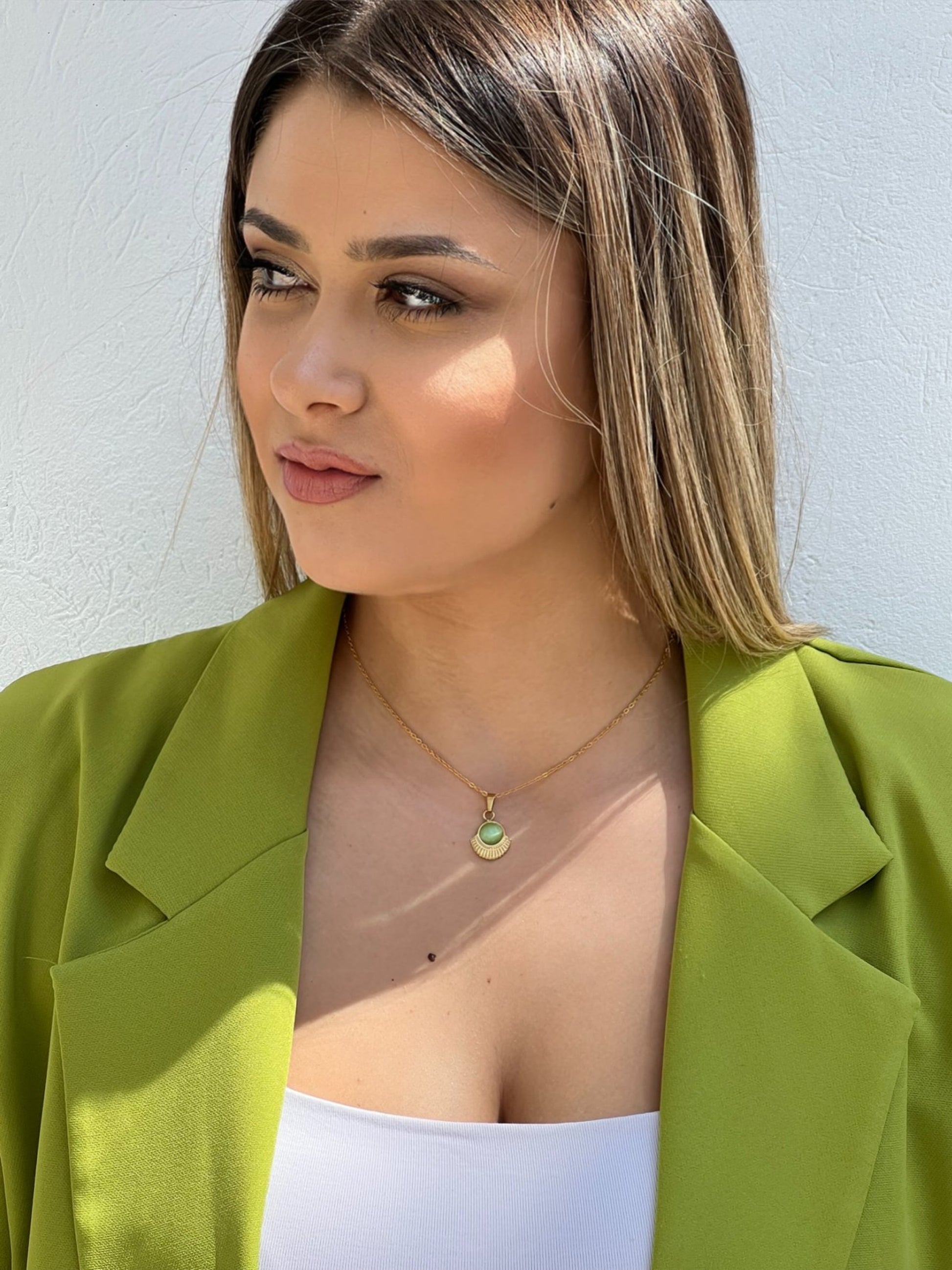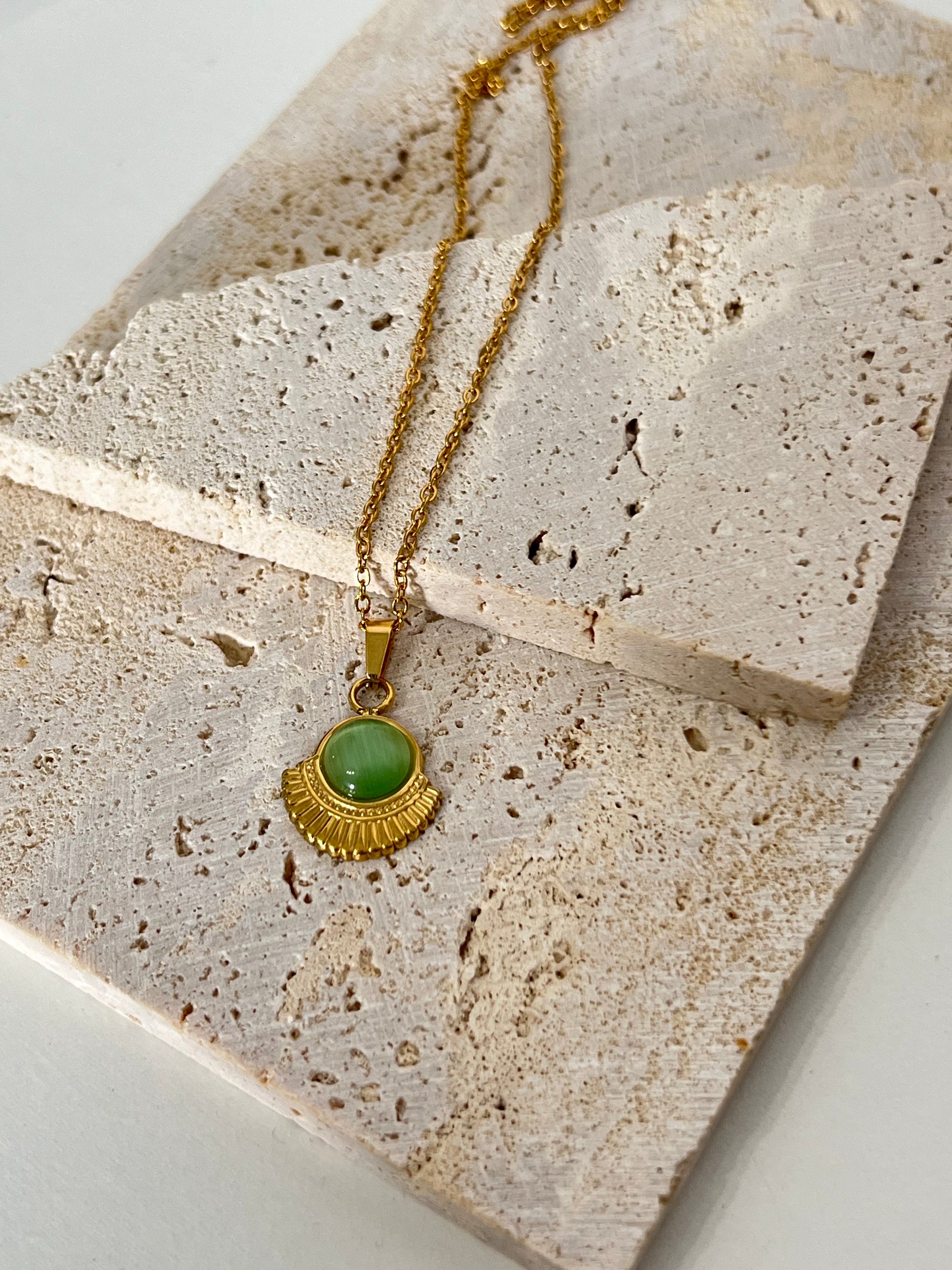 Το Hazel είναι ένα εντυπωσιακό, χρυσό ανοξείδωτο κολιέ διακοσμημένο με μια μαγευτική πράσινη πέτρα. Ανεβάστε το στυλ σας και κάντε μια δήλωση με αυτό το εντυπωσιακό κομμάτι.