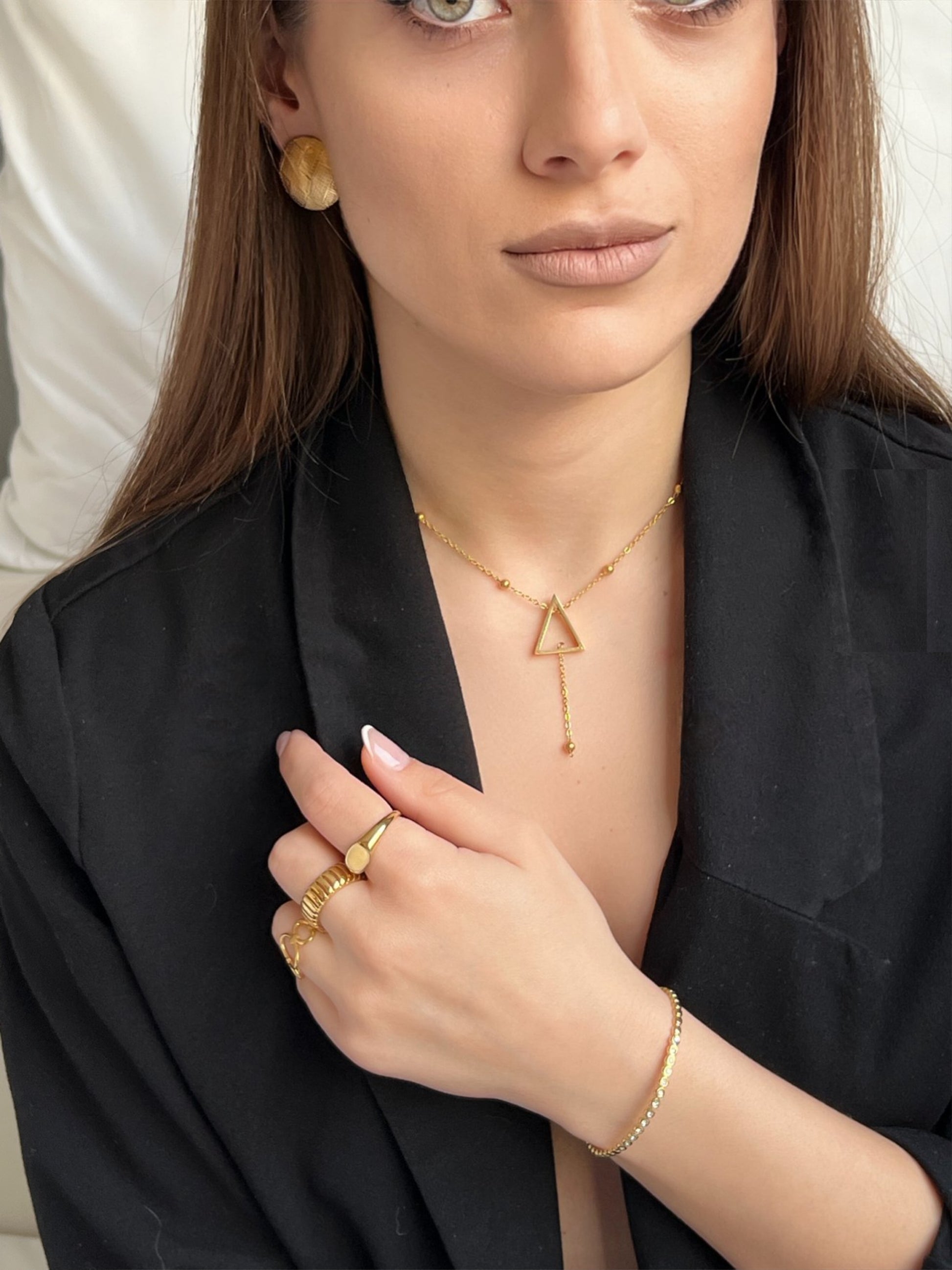 Ανακαλύψτε τη γοητεία του κολιέ Trinity! Αυτό το μοναδικό σχέδιο είναι φτιαγμένο από ανοξείδωτο ατσάλι σε χρυσή απόχρωση για να φτιάξει ένα εντυπωσιακό κολιέ. Ιδανικό για όσους εκτιμούν τις λεπτές λεπτομέρειες και το εκλεπτυσμένο στυλ. Κάντε μια δήλωση με την Trinity!